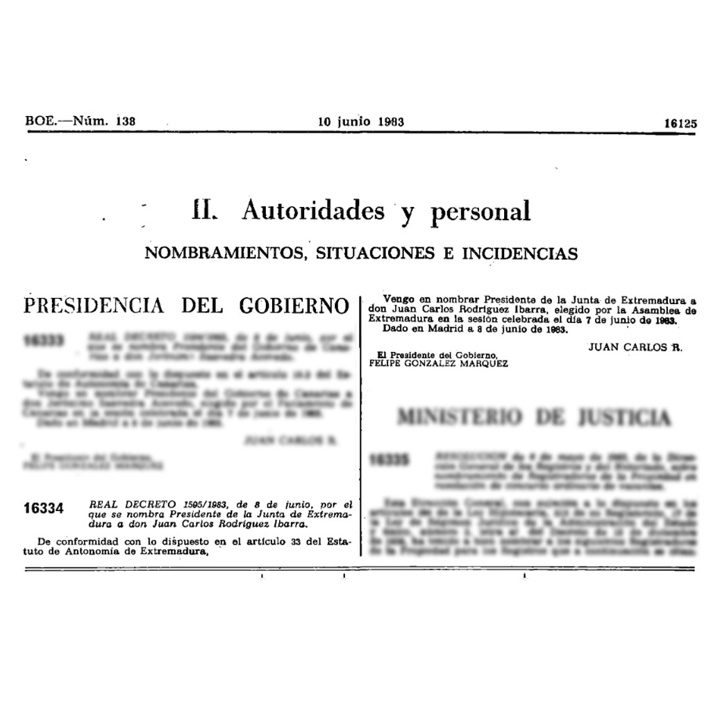 El 10 de junio de 1983 el Boletín Oficial del Estado publicaba el nombramiento de Juan Carlos Rodríguez Ibarra como Presidente de la Junta de Extremadura, tras ser elegido por la Asamblea de Extremadura el 7 de junio de 1983.